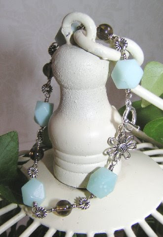 Korussa on amatsoniitin lisäksi savukvartsihelmiä (6mm) ja balinhopearinkuloita. Ensin meinasin laitta vuorikristallia, mutta viime metreillä vaihdoin savukvartsiin. Hopearinkuloiden kanssa kävi hassusti, sillä olin muka tilannut niitä lisää ja aloitin korun tekemisen vanhasta pussista, mutta uudet rinkulat olivatkin paljon pienempiä (siksikö ne niin halpoja olivatkin?) ja siksi hätäratkaisuna jouduin laittamaan kukkasen ketjun jatkoksi. Ei kun tietysti tää oli harkittu ratkaisu, kiva se ainakin on.